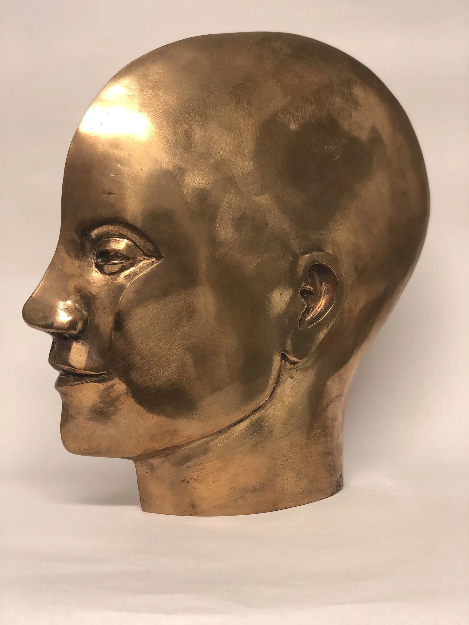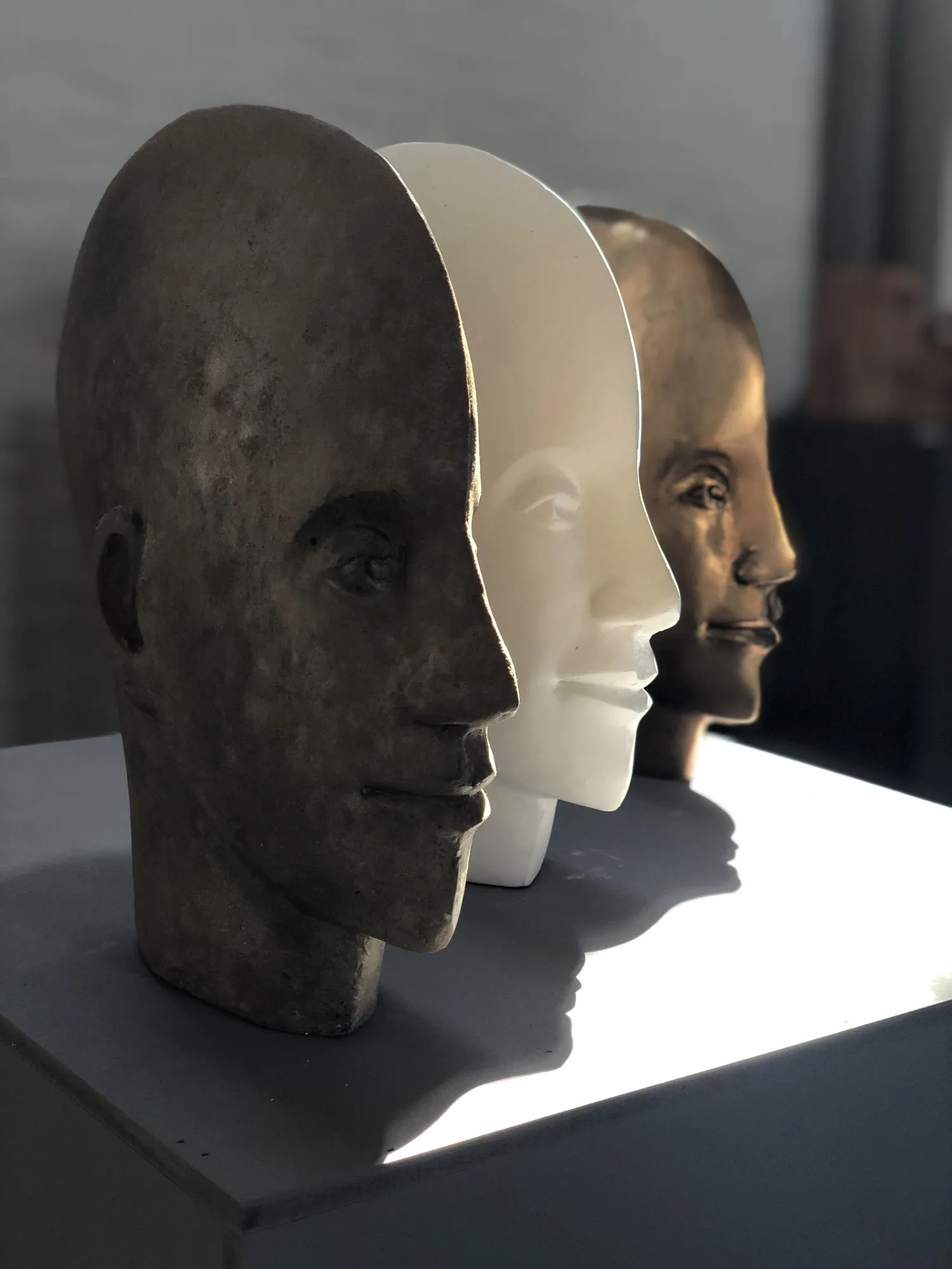 - Nicolette Dresselhuijs -Ik wilde vanuit een cirkel of vanuit een meetkundige vorm een beeld maken. Zo kreeg ik een geabstraheert gezicht. Daarmee experimenteerde ik. De uitstraling verandert door de toepassing van verschillende materialen zoals beton, brons en gips.